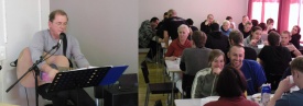 Góð stemning var í matsal Norðlenska á Húsavík í dag. Maturinn rennur ætíð ljúflega niður á þeim bænum en óhætt er að fullyrða að fólk hafði það óvenju notalegt í dag. Þá mætti nefnilega trúbadorinn, veiðimaðurinn, kokkurinn og myndlistarmaðurinn Frímann Sveinsson á staðinn, tók lagið og skemmti fólki.